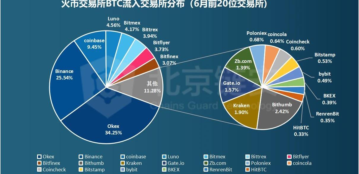 Okex流入的比特幣位居前三的則是:Huobi、Binance、Bithumb,coinbase也有不小貢獻。通過餅圖,我們可以更直觀的了解6月間,三大所的比特幣主要來自于哪里