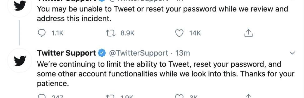隨后Twitter表示在調查期間,某些用戶的發推和重置密碼的功能可能會無法使用。