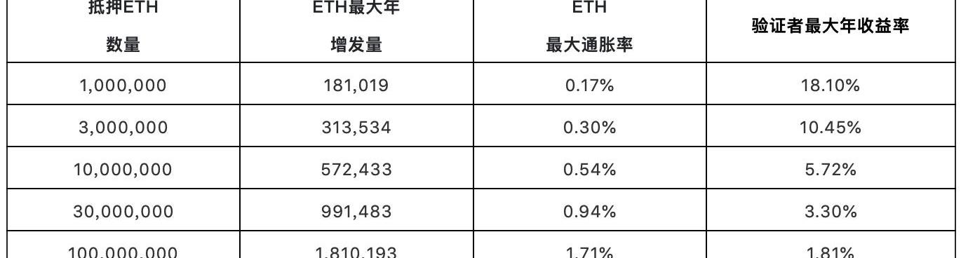 ETH的組成升級到以太坊2.0后,參與者獲得增發代幣的方式由挖礦轉為參與Staking。為了吸引更多的用戶參與Staking,以太坊2.0將驗證者的年收益率與抵押的ETH數量掛鉤。當系統中抵押的ETH數量較少時,驗證者的年收益率會很高,隨著抵押的ETH數量增多,驗證者的年收益率會降低。下表是EthHub給出的ETH年增發量,表中給出的增發量是最大值,如果驗證者受到懲罰的情況出現,實際增發量會小于這個數據。