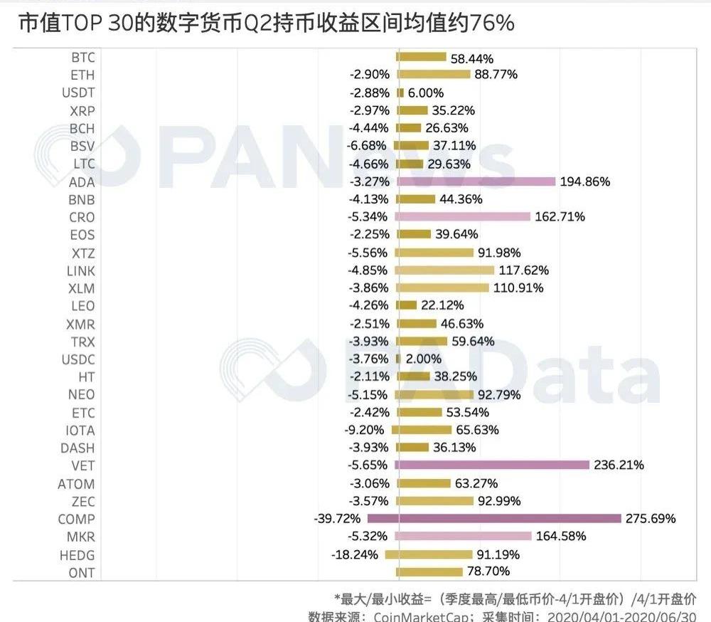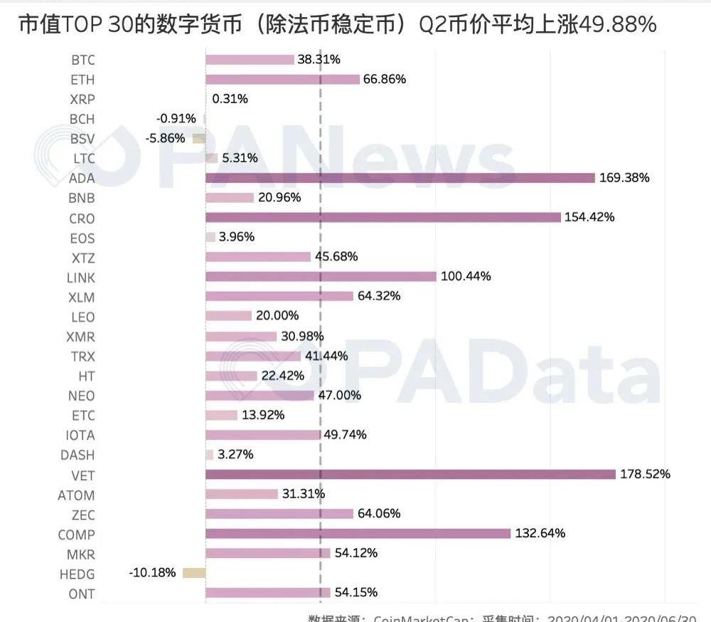 數據分析師|Carol視覺設計|Tina編輯|畢彤彤出品|PANews“出人意料”可能是2020年的主要特征之一。一季度,全球金融市場劇烈震蕩,二級市場“血流成河”,比特幣也難免“黑天鵝”影響,幣價下跌超10%。但二季度,市場表現立即反轉,不僅美國、歐洲、日本等全球主要股市大漲超15%,而且數字貨幣市場也顯現出了牛市氣象。PAData進行了本年度第二次TOP30系列觀察(TOP30指市值排名前30的數字貨幣,下文簡稱TOP30),觀察期為4月1日至6月30日,以期展現在整體單邊上漲的趨勢中,各個數字貨幣的具體表現和市場新動向。PADataInsights:二季度TOP30的總市值上漲約29.81%。二季度USDT和USDC合計向市場釋放了約32.33億美元的流動性。USDT市值已位列第三。除穩定幣以外的其他數字貨幣幣價漲幅約49.88%,創2019年3月以來的新高。VET、CRO、ADA、COMP和LINK的幣價漲幅超過100%。幣價日均波動率從Q1的8.66%回落至5.57%,大約與去年下半年的波動水平相當。COMP為用戶提供了大約是以往6.4倍的激勵,這是COMP的市值短短一個月即超越MKR的重要動力。COMP新晉公鏈幣組團“上位”