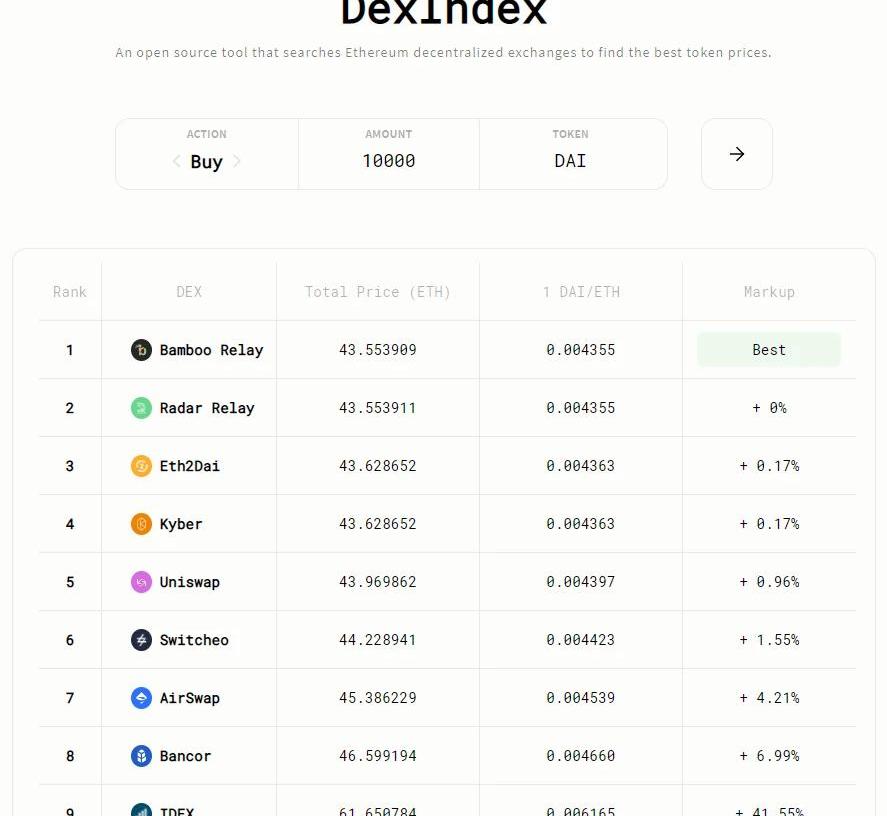 以1inch為代表,交易0.1ETH尋找最佳價格的同時,預估發起該筆交易的Gas費用,此時使用Kyber產生4$的手續費后,這筆交易的性價比是很低的。尋找各DEX中交易的最佳價格也可以通過Dexindex來查詢,以下是計劃使用DEX兌換10000DAI的最佳交易途徑。