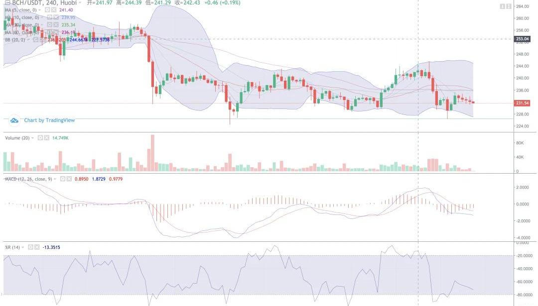 根據CoinMarketCap數據,BCH近7日日均換手率為31.45%,較三個月內日均換手率下降38.06%,較上周日均換手率下降1.01%。本周BCH的成交量有較大程度轉暖,雖然換手率仍呈現下降狀態,但降幅大幅減少。目前BCH處于支撐線上方震蕩,但多次對支撐線的試探,將導致最終會打破支撐,完成多空的倉位調換。BCH的支撐區間在$225一線,若打破支撐區間將進一步尋底。