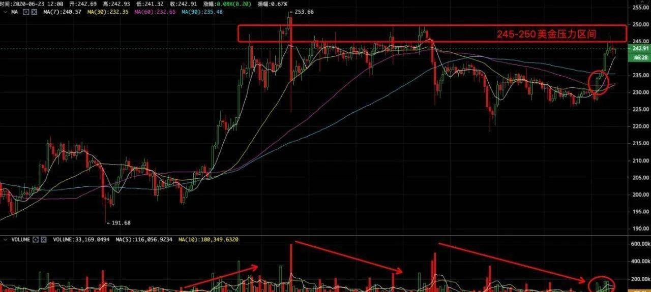 我們從4小時級別走勢圖來判斷,ETH面臨245-250美金區間的強壓區間,存在不小的壓力,僅靠目前的量能是無法順利突破的。接下來看此區間的反彈量能情況,來判斷突破的難度,如果長時間內無法突破的話,橫久必跌便成為可能。