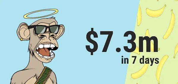 五月初,許多很酷的事情正在發生,BAYC 以每個 Ape 0.08 ETH 的價格進入 NFT 領域。是的,0.08 ETH !沒有人懷疑任何事情,只是又一次有趣的 pfp 發布,除了他們在第一周賺了大約 730 萬美元。幾乎沒有人預知到猿類的光明未來。