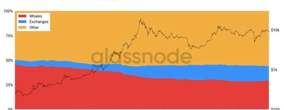 圖3:巨鯨在比特幣生命周期中持有的BTC余額但是,為了評估巨鯨們在比特幣市場上的整體優勢,我們必須考慮一個事實,即:早些年比特幣的總供應量比較低,所以那時候巨鯨在市場中可以輕松占據主導地位,而這樣的市場主導地位的確也持續了相當長一段時間。在下面的圖4中,我們發現雖然比特幣巨鯨持有BTC的余額在2016年才達到頂峰,但他們的市場主導地位其實從2011年初就已經成型并達到峰值,但此后便一直處于近乎恒定的下降狀態。這意味著,盡管近期比特幣巨鯨的市場統治地位在下降,但是這種變化似乎并沒有對比特幣價格形成影響,尤其是在最近十年時間里,比特幣價格一直保持著持續增長態勢。