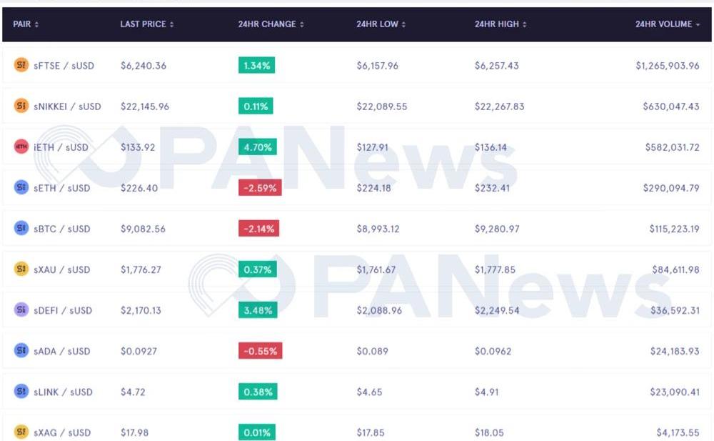合成資產Synthetix無疑是2019年表現最好的項目之一,全年SNX價格上漲2734%,并且抵押SNX可以獲得近100%的幣本位收益。這一輝煌成就在今年6月得到了延續。從去年年底到今年第一季度,SNX的價格曾從1.46美元跌至0.38美元,跌幅高達74%。但SNX的價格在6月份再創新高,截至目前仍在連續創出新高。通過抵押SNX,可以生成合成資產,并在synthetix.exchange中與其它合成資產交易。合成資產不光包括了加密貨幣和反向加密貨幣,還包括大宗商品、外匯、指數。目前,與穩定幣相關的交易對中,成交量最大的合成資產正是sFTSE和sNIKKEI,甚至超越了一般去中心化交易所的總體成交量。