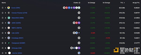 DeFi項目鎖定資產前十排名及鎖倉量 數據來源:defillama