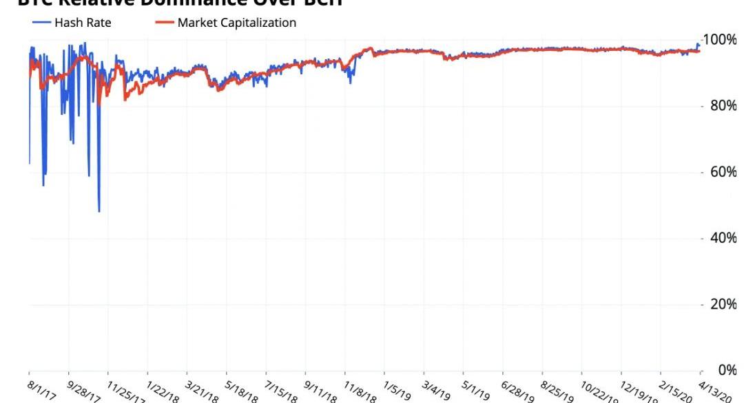說到比特幣現金,自2017年8月從比特幣分叉以來,其與比特幣的關系如何?就市值和算力而言,比特幣的優勢是壓倒性。截至4月12日,相對于比特幣現金,比特幣維持著98%的總算力和96%的總市值。