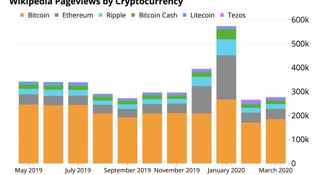 盡管以太坊的瀏覽量在2020年1月左右激增,但維基百科的瀏覽量比特幣的占比仍然在70%以上。比特幣的Wiki已被翻譯成99種不同的語言,自2019年初以來,總瀏覽量超過1000萬。