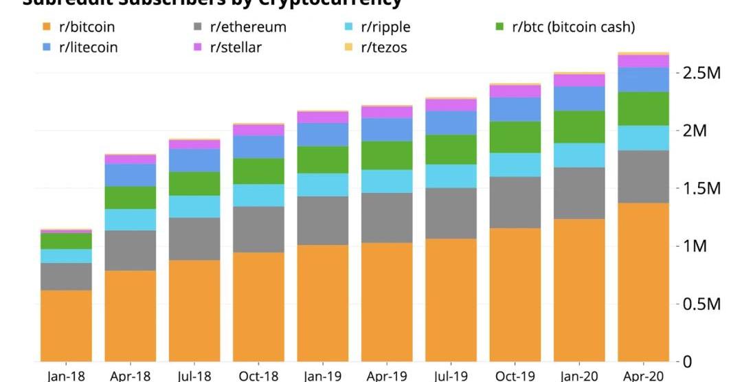 同樣,比特幣話題用戶數占Reddit用戶總數的50%左右。2018年以來,比特幣的reddit訂閱用戶數幾乎翻了一番,達到130萬。
