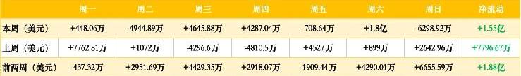 資金方面,上周資金波動較大,其中周六凈流入最大,超過1.8億美元;周二凈流出最大,接近5000萬美元。