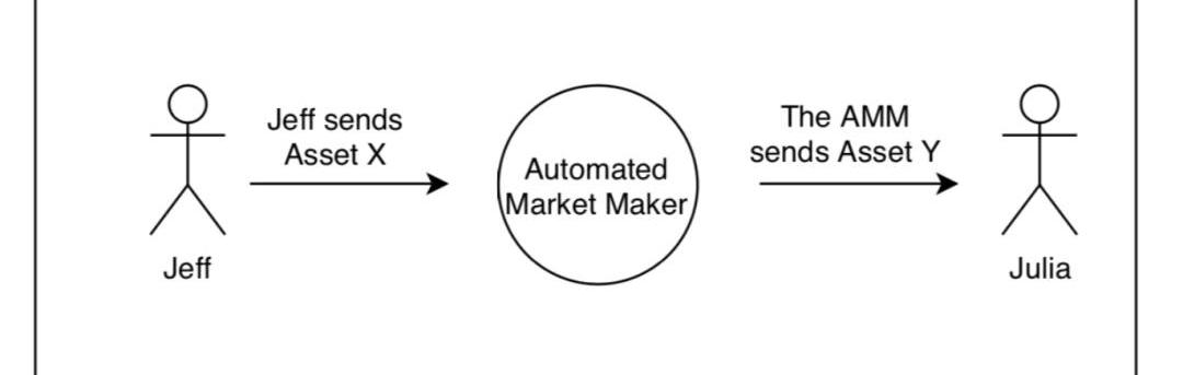 圖2:在某區塊鏈上的資產轉移過程自動化做市商使得某區塊鏈上的各資產之間能進行無摩擦交易。某區塊鏈上的自動化做市商,簡單來說,就是一個由多種資產組成的資金池,其預先編程好的定價曲線會根據池中每種資產的數量對池中的資產進行定價。當用戶與資金池交易時,池中各資產的數量會發生變化,結果,池中資產的價格也會根據定價曲線而變化。