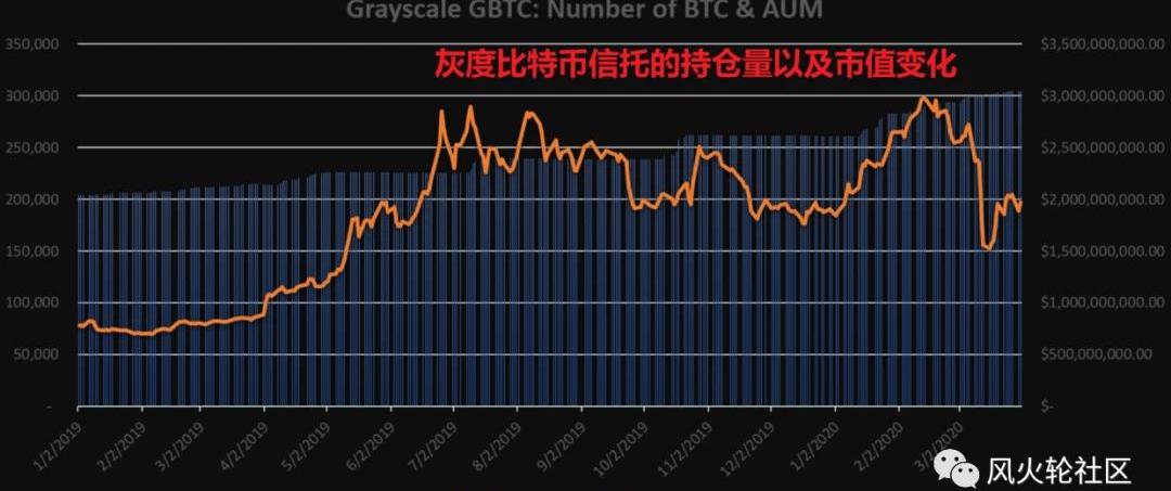 其比特幣信托的量在32億美元,除去溢價,其背后的btc持倉量估計已達到35萬枚btc。而值得注意的是這幾年,不管幣價如何變化,這個信托基金GBTC的持倉量一直在增加,下圖是之前的一份近一年的持倉與市值變化:
