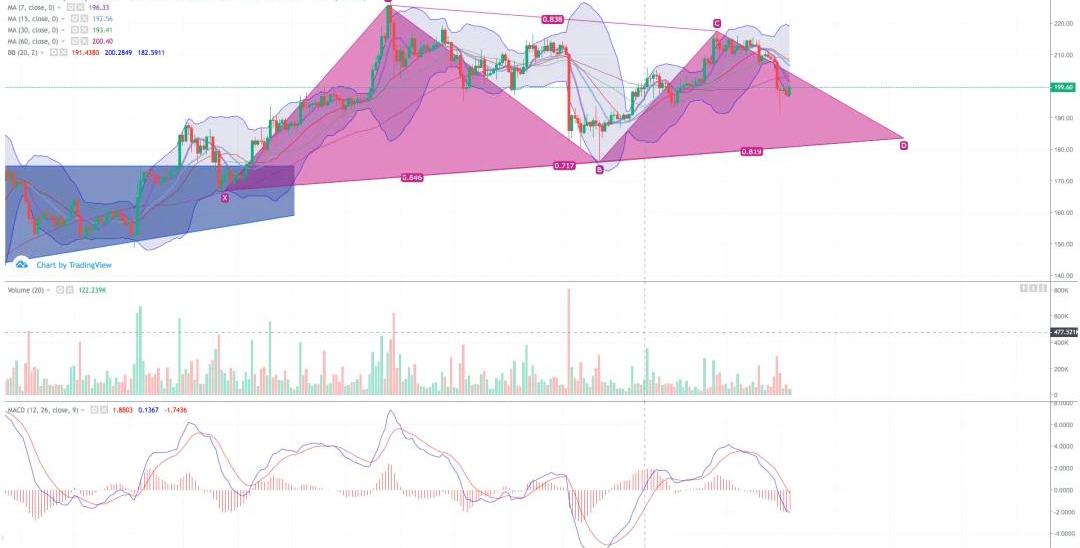 根據CoinMarketCap數據,ETH近7日日均換手率為65.87%,較三個月內日均換手率下降了23.92%,較上周日均換手率下降23.79%。ETH成交額降幅較大,資金流出比較明顯,投資者對市場熱點的敏感度下降,對ETH2.0處于一種觀望狀態。ETH以做空為主,止損點設為$205,止盈點進一步下移為$180。