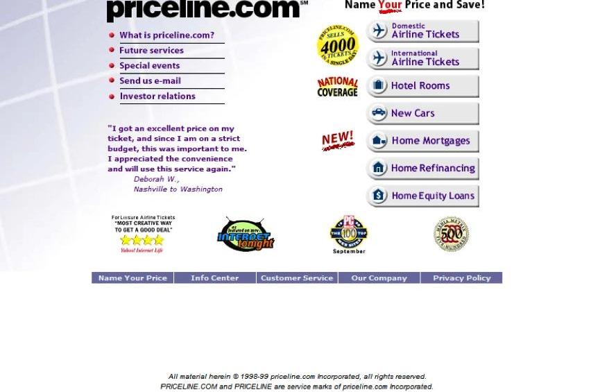 回到1999年3月。一家叫Priceline的在線機票銷售商上市,發行價19美元,IPO首日漲到了88美元。此時距離Priceline網站上線僅僅11個月時間,不過就這短短的11個月他就燒掉了1.5億美元。即使這么燒,Priceline當時每天也只能賣出幾百張機票,并且每賣一張就賠30美元。1999年,虧錢是成功的.com公司的標志,每家都在虧錢,但很少有公司能像Priceline虧的那么有創造性。