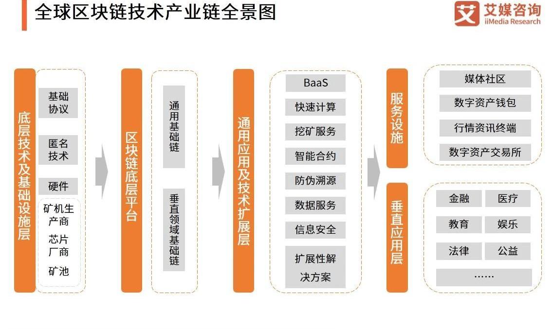 目前全球區塊鏈產業鏈主要分為底層技術及基礎設施層、區塊鏈底層平臺、通用應用及技術拓展層、服務設施和垂直應用層五大結構。在我國,2019年區塊鏈產業規模約12億,金融作為目前落地項目最多、場景最為豐富的行業。在我國區塊鏈技術產業鏈中,垂直行業應用已然覆蓋包含醫療、物聯網、法律、能源、溯源、公益、娛樂等眾多領域;通用應用及技術拓展層也覆蓋智能合約、信息安全、BaaS、挖礦服務、數據服務、解決方案等;從底層技術及基礎設施層來看,我國提供數字貨幣挖礦設備的比特大陸、嘉楠耘智、億邦科技三家企業是全球主要的硬件提供商,占據了全球市場90%的市場份額。此外,在匿名技術和基礎協議方面,我國也取得一定的發展成果。歷屆兩會區塊鏈關鍵詞