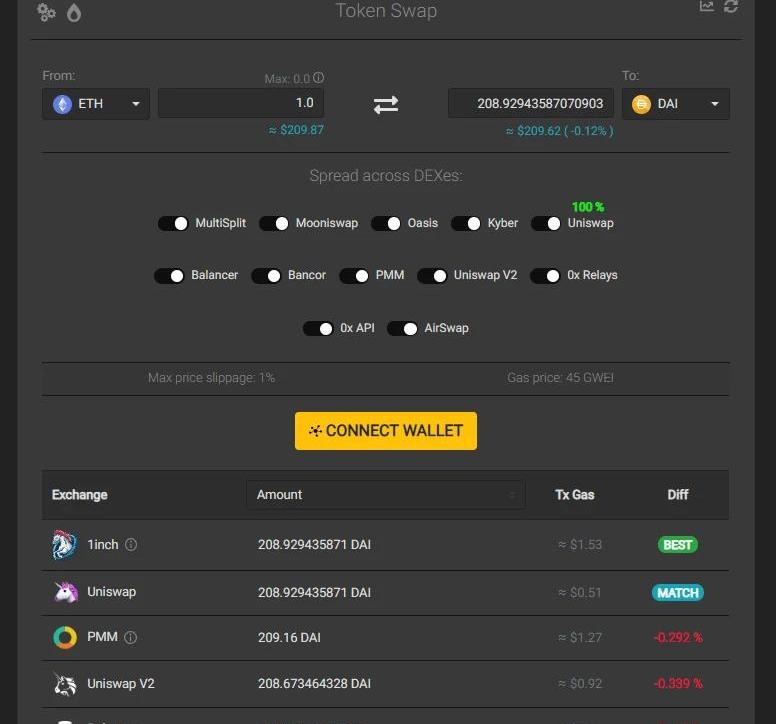 關鍵詞:1inch,Totle,Dex.ag原來這些項目幾乎無人問津,可隨著DEX火爆起來之后,DEXAggregator,也理所當然的被“帶飛”。因為DEX幣種分散,深度和流動性遠不如CEX,所以對于用戶來講,想要買到自己心儀的幣種,或者說足夠量的幣種,必須同時使用多個DEX,這時候,若是有一個單點,可以幫你直達所有的DEX,就像最早時候大家用的類似Hao123.com之類的導航網站,是不是會方便很多?尤其是,這個導航網站,還會自動選擇合適的DEX,幫你把鏈上各家DEX的流動性合并起來,減少交易滑點,是不是很棒?以最出名的聚合器1inch為例,界面類似這樣的: