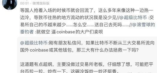 國內交易所流向美國合規交易所,大戶的安全考量是一方面,另外一方面是籌碼會自然從市場冷的地方流向市場熱的地方。現在國內的人只想賭合約,自然對買比特幣和提走比特幣沒什么興趣,那么自然比特幣就會流到對它有興趣的地方,比如美國。前兩天微博還有人提到這個問題,我覺著法海說的沒啥毛病: