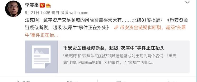 李笑來與幣安這一撕最早可以追溯到5月21日,那時正值幣安深陷自媒體的“資金鏈斷裂說”之中,何一忙著辟謠時,沒想到幣圈大V李笑來出現了,不經意傳了個謠。