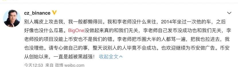 趙長鵬在微博上回應在幣圈,BigONE一直被認為是云幣網在中國“9·4”政策之后的國際版,兩家平臺的投資人中都有李笑來。去年,另一個李笑來投資的區塊鏈項目Mixin出現在了BigONE上,由李老師設計的ETF基金產品BOX的組成幣種之一便是Mixin發的幣XIN。“以天計年”的幣圈,打理交易所稍微松懈一點,流量便散了。去年,IEO、Staking高潮迭起,2018年就成立了老牌所BigONE沒見一點聲響。5月,沉寂了一年的BigONE露出了復活跡象。月初宣布了中文名“幣格”,合約、借貸產品都已經擺在架上,坐等流量歸來。5月,李老師變成了“李老撕”。與幣安的這波“撕”能升級,也算是何一的成全,她一直不愿意讓幣安在輿論場上吃虧。你看,李笑來后來錘共識實驗室的創始人王峰時,就沒有掀起這么大的風波。