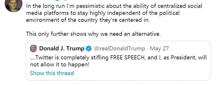XRP/HKD-1.75%編者按:本文來自Unitimes,作者:Johnny,星球日報經授權發布。本周三,在美國總統川普(DonaldTrump)被Twitter“事實核查”之后,加密社區加入了社交媒體審查的大辯論中。以太坊聯合創始人VitalikButerin轉發了川普關于Twitter“扼殺”言論自由的評論,并表示:“從長遠來看,我對中心化的社交媒體平臺保持高度獨立于其所在國家的環境的能力感到悲觀。這只會進一步表明,我們為什么需要另一種選擇。”