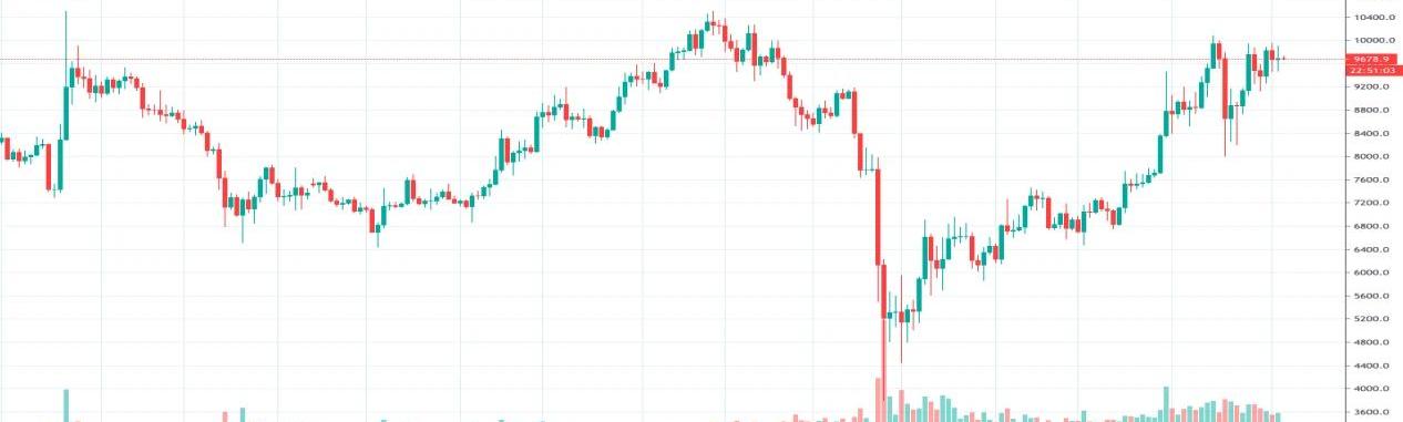 圖3:比特幣vs黃金價格走勢-skew據美國約翰斯·霍普金斯大學發布的新冠疫情最新統計數據顯示,截至5月19日10時32分左右,全球新冠肺炎累計確診病例超過480萬例,累計死亡近32萬例。其中,美國新冠肺炎死亡病例超過9萬例,為90340例;確診病例超過150萬例,為1508291例。不斷攀升的新冠肺炎死亡病例數和確診病例數均表明當前全球抗疫形勢不容樂觀,全球經濟復蘇尤其是歐美國家相關企業復工復產尚需時日,市場恐慌與避險情緒依然沒有消除,再次影響下黃金價格可能會繼續走高。對比了黃金與比特幣的價格走勢圖后,我們來看OKExBTC/USDT1DK線圖,截圖來自Tradingview,幣價自3月13日觸及近期最低價$3791.9開啟快速反彈以來,已幾乎收復全部跌幅,幣價再次逼近$10000整數關口,期間5月10日經過了大幅回撤1000點后,技術形態上依然保持著上漲趨勢,突破該整數心理與技術壓力位僅僅一步之遙。