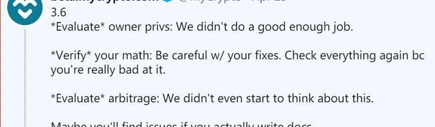 3.6評估合約所有者的特權:我們的工作不到位。驗證你們的算法:小心打補丁。重新查驗一切因為你們的算法真的太爛了。驗證套利交易:我們都還沒開始考慮這個問題。也許你們在寫文檔的時候就會發現問題了。