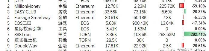 \t\t本\t本周市場概況與走勢周市場概況與走勢\tPART.2Dapp分析在本周Dapp總排行榜中,相比上周以抽獎與游戲類為主的Dapp,本周類別已經開始呈現出多樣化,金融類也有3個上榜。并且柚子和波場的Dapp數量已經有趕超以太坊的趨勢,說明除了以太坊,別的公鏈也開始活躍起來。本周888Tron這個抽獎類的Dapp表現突出,交易額翻了將近3倍,上周Dice交易額上漲最多這周登上榜首。MillionMoney從榜首掉下來,表現不佳,交易額縮了59%。