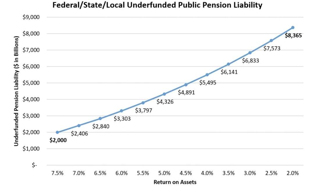 而為了達成7.5%年化收益率的目標,無風險的自然增長顯然是不夠的。你不得不讓資金暴露在股票或者公司債等風險較高的市場之中,而在正常情況下,只有在公司剛剛度過虧損期且市場保持較強波動性的情況下,才能夠比較穩定地獲得7.5%的預期收益,但這種機會并非一直存在。而如若我們假設養老金的年增速只能保持在一個更為現實的水準下運行,那么上面提到的養老金缺口,可能會達到一個8萬億美元的可怕水平。