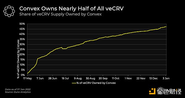Convex現在是veCRV的最大單一所有者,占總供應量的47%。這賦予了他們最大的治理權力來決定CRV激勵措施的分配。