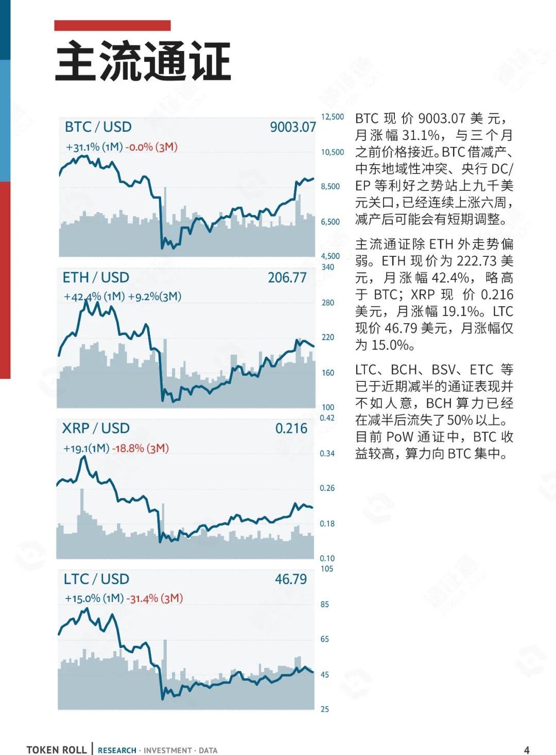 XRP/HKD-5.28%截至2020年5月5日,全球數字通證總市值為2550.72億美元,相比期初上漲672.4億美元,漲幅為35.8%。四月日均成交額為1338億美元,較上月下降173億美元,跌幅為11.4%。2020年4月16日,央行DC/EP在農業銀行、中國銀行的客戶端試運行。蘇州相城區將首先進行DC/EP試點,部分公務員的交通補貼將以交通補貼的形式發放。DC/EP是由央行發行、國家信用支持的法定數字通證,是國家法幣的數字化形式。央行DC/EP的發行,能夠提升貨幣政策效率、促進人民幣國際化、捍衛國家數字金融主權。本月,通證通編制的20個BICS二級行業指數全面上漲。其中供應鏈行業指數漲幅達到96.9%,項目服務行業指數達到57.9%。而T10、T10X指數僅上漲34.8%、34.9%,落后于BTC以及大部分行業指數。四月BTC難度與日均算力大幅增加,接近前高,七日平均算力達到約119.4EH/s,但考慮到容納了其他PoW通證的多余算力、減產后礦工收益將大幅降低等因素,BTC算力短期內或將達到飽和。BTC平均活躍地址數增加到77.5萬個,為近三個月最高,BTC的90日均NVT比率約為72.9,表明近期BTC基本面持續轉好。