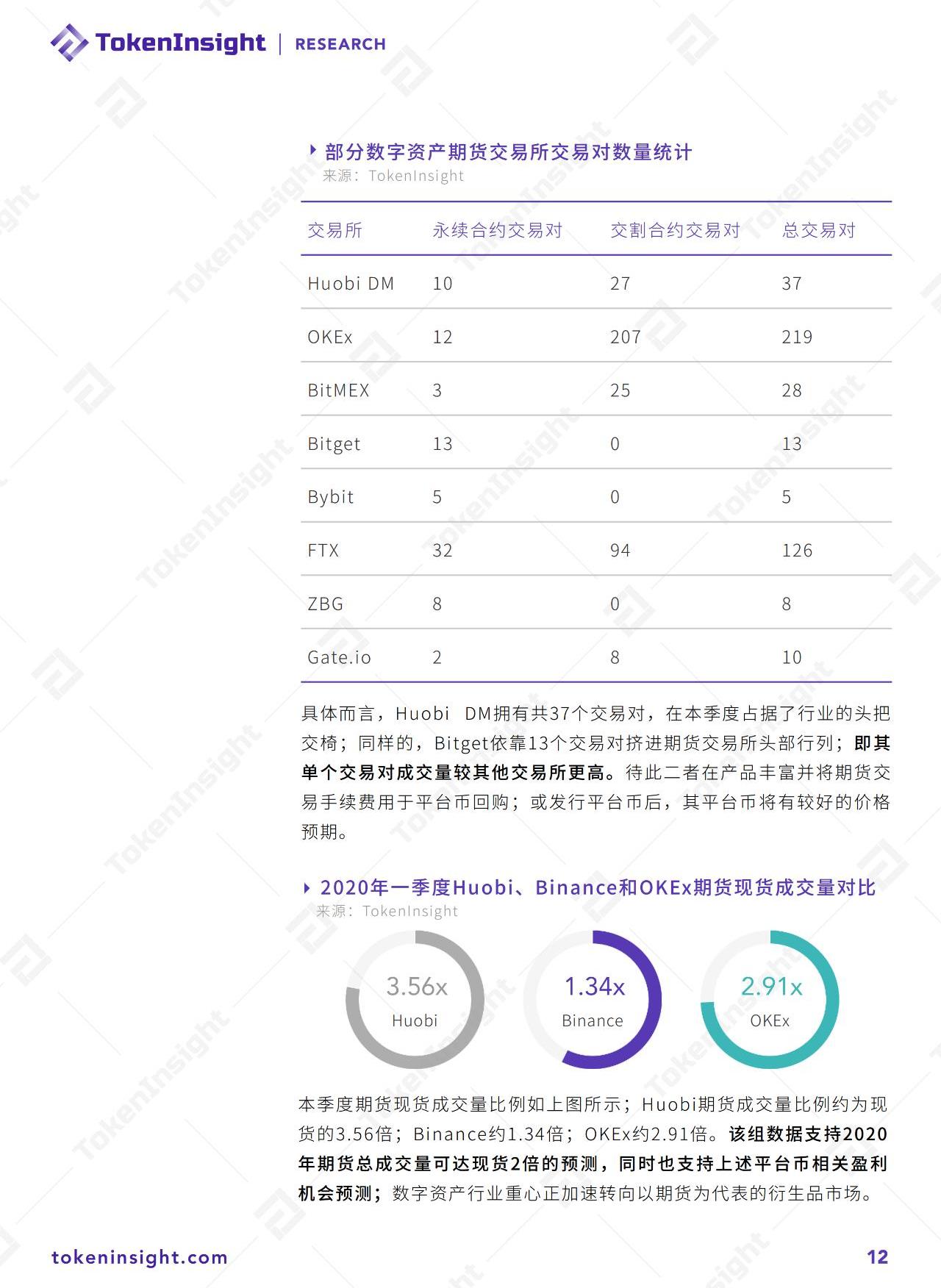 1.2萬億美金2020年Q1數字資產衍生品成交總量破$2萬億大關,較去年四個季度平均值上漲314%。2.單日最高成交$625億本季度全市場日均成交量為$233億,較去年上漲274%;單日最高成交$625億,該數字出現于312暴跌次日,即2020年3月13日。3.獨立2020年Q1衍生品與現貨市場交易相關性為0.31,顯著低于19年Q4的0.76,表明數字資產期貨投資者或已相對獨立于現貨投資者。4.先行指標數字資產期貨已部分具備市場先行指標屬性,現貨投資者可參考期貨成交量進行倉位管理。5.不建議數字資產期貨主力合約占市場總成交量90%以上,由于流動性和行情不確定因素,暫不建議投資者大量交易其余合約。部分交易所目前僅上線了主力合約,有助于保護投資者。6.穩步攀升COVID-19和石油戰導致全球資本市場浮現現金為王的觀念,但數字資產期貨成交總量仍在穩步攀升。7.市場頭部六家衍生品交易所中,HuobiDM和OKEx各切走略低于30%的市場份額;BitMEX占20%。8.盈利機會BitMEX龍頭地位不保,后市可關注行業內優秀者平臺幣動向。部分交易所單一合約成交量很高,潛在發展空間值得期待。9.早期階段在數字資產領域,期權市場目前發展仍處于早期階段,期權交易量與期貨相比仍有幾十到上百倍的差距。10.布局數據顯示,總成交量快速下降后,頭部期貨交易所成交額恢復同一水平。市場縮量之時,是交易所進行擴張的良機。11.合規Huobi、OKEx、Binance和Bitget等交易所獲得新加坡金融管理局發放的數字資產支付服務豁免權。