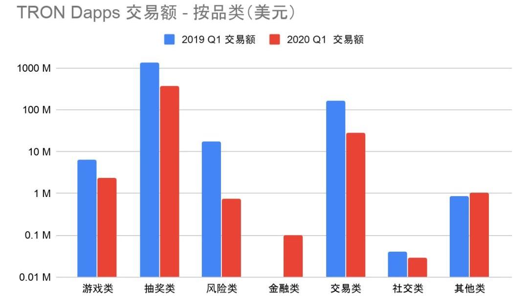 波場2020年Q1Dapp總交易額為4.11億美元,同比下降73.8%。去年上半年,波場抽獎類Dapp蓬勃發展,涌現出一批抽獎類Dapp,抽獎挖礦代幣分紅機制吸引了大量用戶參與,如888TRON曾創造過單日交易額8,200萬美元的記錄。隨后抽獎類Dapp熱度持續走低,今年在波場并未誕生爆款抽獎類Dapp,交易量趨于平穩,日均交易額為457萬美元。