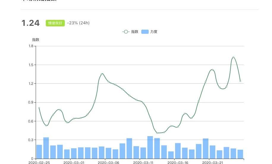 本期要點綜述:根據標準共識情緒指數反映,目前市場情緒良好,最新指數為1.24,市場已完成由悲觀向良好的轉換,市場情況逐步修復完成,但目前數字貨幣市場與全球金融市場具有高度相關性。所以新增資金還處于觀望狀態,當疫情和經濟出現根本性好轉后,增量資金將會再次爆發做多熱情。
