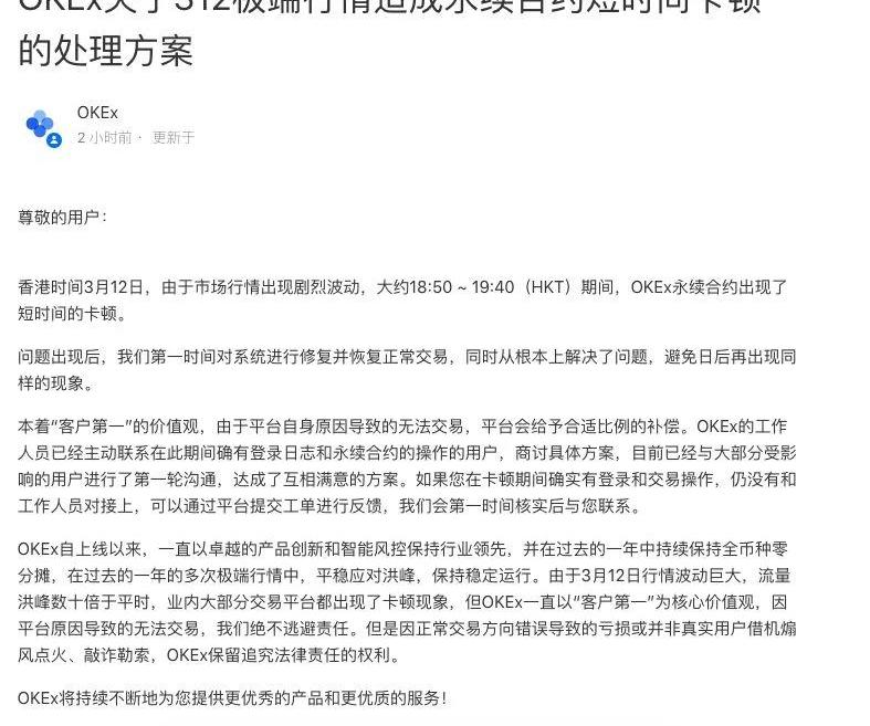 3月23日上午,兩張“維權”圖片傳遍了幣圈,“維權”對象分別指向兩家數字資產交易平臺——火幣和OKEx。涉及兩家平臺的網傳“維權”圖中均有人員聚集、手持大字報等行為。有媒體報道,針對兩家交易所的“維權”,或與3月12日加密貨幣市場出現極端行情時交易平臺出現卡頓導致用戶無法操作有關。目前,火幣和OKEx都提供合約交易服務。有投資者反饋,3月12日,比特幣從7780美元暴跌超過20%收于6133美元,極端行情下,火幣和OKEx的合約交易頁面都曾出現過卡頓情況,用戶的平倉、開倉操作受到短暫影響。極端行情下,用戶無法操作倉位,常被投資者稱為“宕機”。3月23日下午,OKEx和火幣相繼針對“維權”事件做出回應。OKEx“關于312極端行情造成永續合約短時間卡頓的處理方案”的公告顯示,3月12日18:50~19:40期間,OKEx永續合約出現了短時間的卡頓。該平臺表示,由于平臺自身原因導致的無法交易,平臺會給予用戶合適比例的補償。