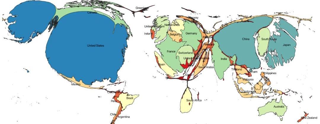 世界各國的文件來自ArcGISHub現在,我們按GDP來對各國加權,這將讓你大致了解全球收入分配情況。這意味著某些較發達的國家將膨脹,而較不發達國家將萎縮。但我會盡力保留這些國家的總體形狀,以便使地圖仍然清晰易懂。