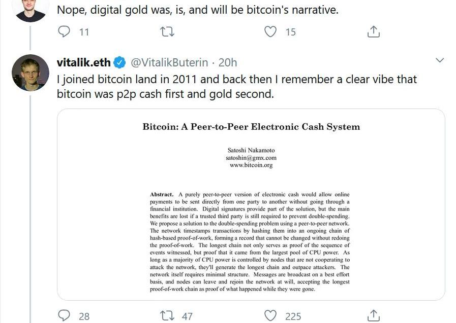 Buterin認為比特幣原本打算用作點對點電子現金,這一觀點已為許多人所支持,而中本聰在2008年發布的比特幣白皮書的標題也體現了這一點。實際上,比特幣白皮書的第一行內容是:“一種純粹的點對點版本的電子現金將允許在線付款直接從一方發送到另一方,而無需通過金融機構。”為什么關于數字黃金的辯論很重要?