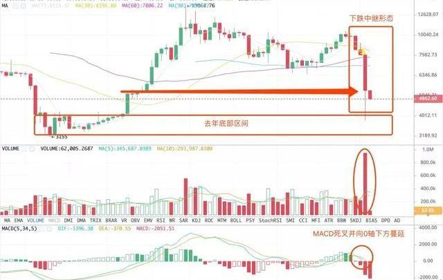 BTC早間沖擊6000美金,隨后就被空頭打壓了下來,下午隨著A股的下跌,跌幅逐漸加大,短時在4800美金徘徊。從盤面看,空頭的下砸量能仍然遠大于多頭的抄底力量,短期的形勢依舊嚴峻,不建議盲目進場抄底博反彈。