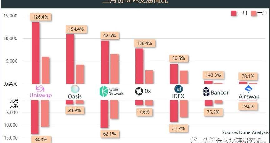 注:交易額通過智能合約統計,如果一個交易在Kyber上完成,而流動性來自Uniswap或Oasis,那么交易會被統計兩次。整個二月份,統計中的DEXs總交易額為4.77億美元,較一月份增長101.9%,這一方面得益于ETH價格的增長,另一方面得益于交易人數的增長。