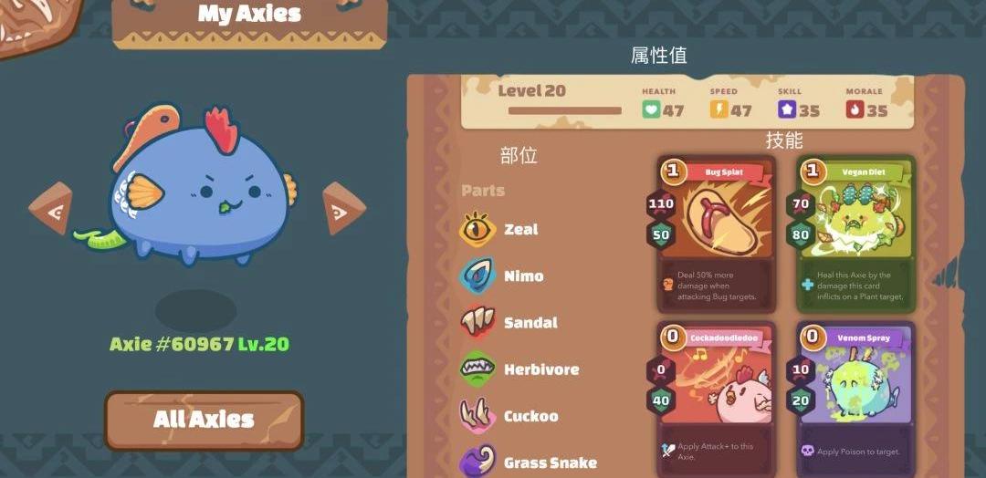 身體部位:每個Axie都有6個身體部位:眼睛,耳朵,角,嘴巴,背部和尾巴,這些部位也都有各自的種類。角,嘴巴,背部和尾巴的樣子決定了Axie在戰斗中可以使用哪4個技能牌。部位的好壞是決定Axie好壞的最重要因素。那么重要知識點來了,如何鑒定一只Axie是否強大?主要有3個方面,以下圖的1883號Axie為例:屬性分布:Axie的屬性總值都是164,那么屬性點的分布就決定了Axie是DPS還是坦克。技能值和士氣值是DPS最需要的,1883Axie的技能值31,士氣值58,總和89,是相當出色的DPS屬性。技能種類:與Axie自身種類相同的技能牌會造成20%的額外傷害。1883Axie是一個野獸,而且它的4張技能牌有3張都是野獸牌,所以它有巨大的DPS潛力。技能牌數值和效果:技能牌由4部分組成,能量消耗、攻擊力、護盾和效果。作為一個DPS,1883Axie的技能牌攻擊力都在100左右,都是比較高的。卡牌效果也都比較實用如加傷害和偷取能量。