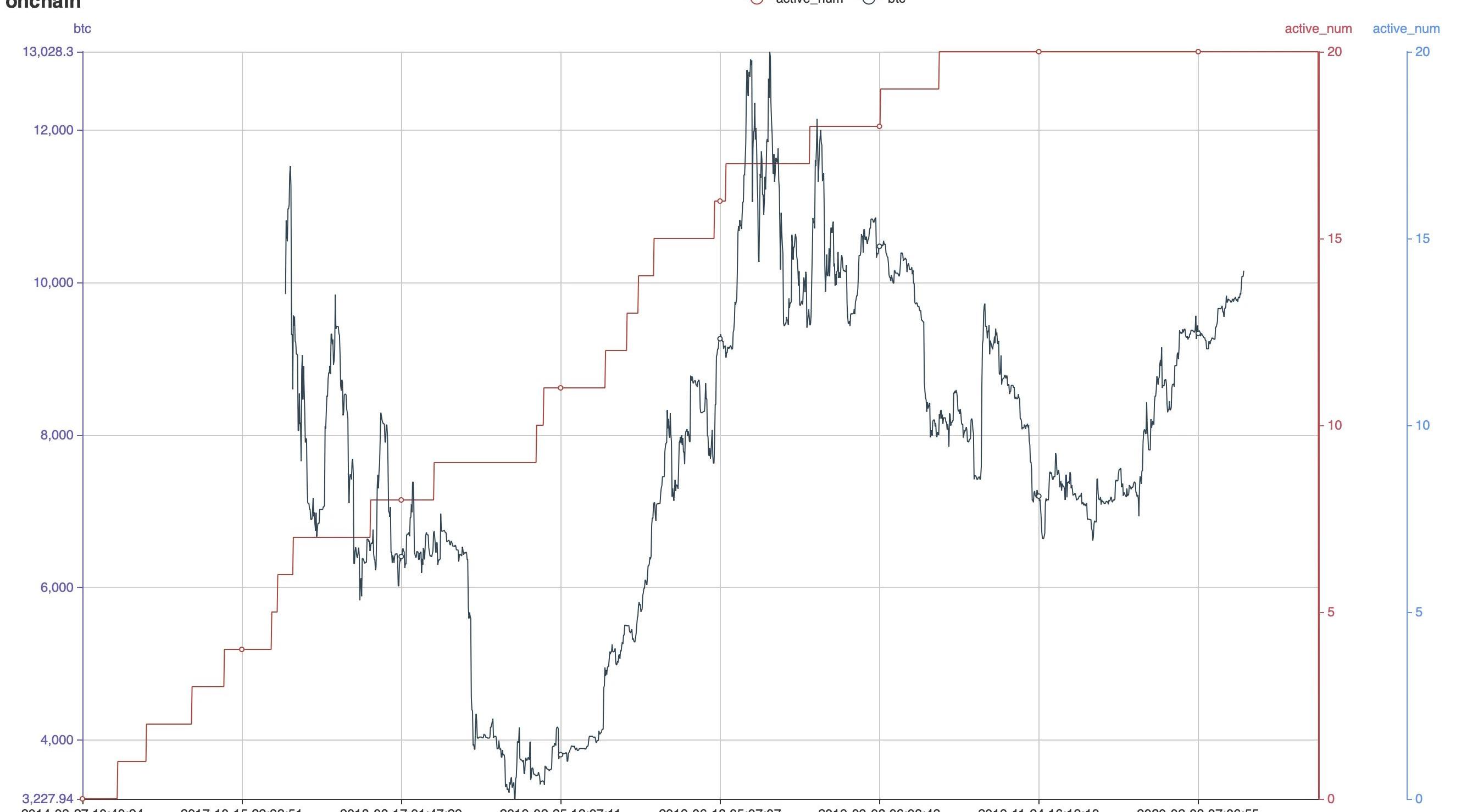我們對三個時間點的地址余額進行對照,并分別以18年底大跌前、后以及現在的余額的log值為坐標在平面圖上予以展現。不難發現18年底大跌之后,很多新地址余額突然從0躍遷至同一正數數值;亦有很多地址從第一次有余額開始從未變化。這些地址的特殊行為都不具有明確的市場價格分析價值,據此我們排除掉了2018年底以來轉賬行為高度一致的所有地址以及第一次取得余額后至今沒有發生任何變化的地址。事實上,篩選之后我們僅有20個大地址剩余在樣本里供我們進一步分析,其余額歷史曲線結合比特幣價格曲線展示如下: