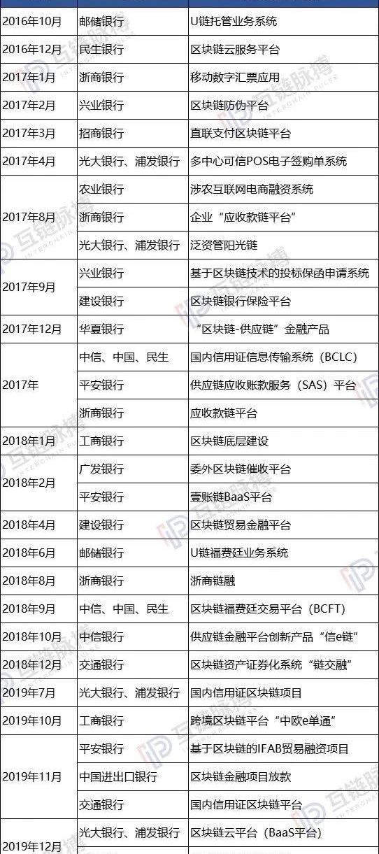 XRP/HKD-2.68%編者按:本文來自互鏈脈搏,作者:金走車,Odaily星球日報經授權轉載。銀行業和區塊鏈的結合正駛上快車道。就在2月末,央行發布了《金融分布式賬本技術安全規范》。此舉被認為區塊鏈在金融領域的應用被央行認可,區塊鏈在金融領域的發展障礙破除大半。在金融領域無論是體量還是影響力,銀行都是老大哥。互鏈脈搏梳理了國有商業銀行、專業銀行、股份制商業銀行等20余家銀行機構的近30個區塊鏈項目,并找到了這些項目的區塊鏈技術服務商。銀行區塊鏈布局:重在基礎設施建設、供應鏈金融
