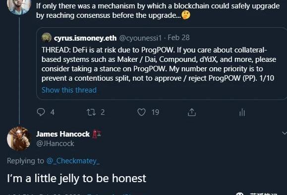 對這種情況的解讀是,ProgPoW爭議很大程度上集中于討論以太坊的權力結構,而不是ProgPoW的技術優點。在很多方面,這次爭議跟比特幣的擴展/SegWit之爭相似,這場爭議持續多年,并最終變成誰來真正控制比特幣的問題。是用戶、礦工還是開發者或經濟節點?而不是聚焦于SegWit有什么技術優勢的問題。這是一件好事。正如斯賓賽·努恩指出的那樣,這是以太坊成熟的跡象,它達到了300億美元網絡的階段。其中超過10億美元鎖定在杠杠、價格敏感的DeFi應用上,并且有重要并行價值依賴于其原語、協議以及人們。