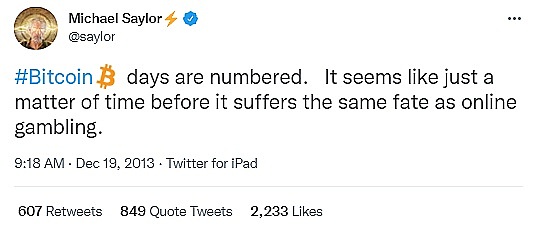 首席執行官邁克爾·塞勒曾透露,他每秒購買 1,000 美元的比特幣。與其他通常回避討論個人投資的 CEO 不同,塞勒公開表示他個人持有 17,732 枚比特幣,目前價值超過 8.32 億美元。根據 BitInfoCharts 的數據,這使塞勒已經躋身在比特幣持有者前 100 名之列。但塞勒卻并不是第一個支持比特幣的 CEO,因為他曾在 2013 年發推諷刺比特幣:比特幣的時代已經屈指可數,它將走在線賭博的道路:競爭或監管不復存在。