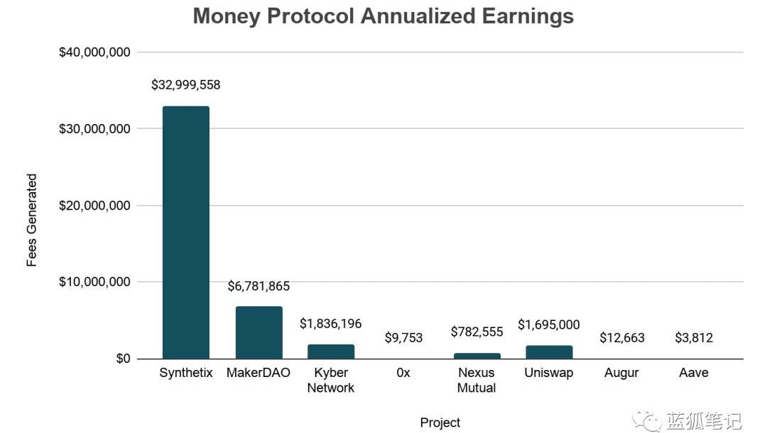 這算是我們所選的貨幣協議的背景,以及它們是如何通過使用量來捕獲費用。*Synthetix它是一種合成資產發行協議,其中SNX持有人可以質押代幣,并賺取通過交易合成資產所產生的費用。*MakerDAO在多抵押Dai中,DSR和穩定費之間的點差可用于銷毀MKR。*KyberNetworkKNC代幣用于支付代幣交易費用,其中一部分KNC被銷毀,并從流通供應量中永久移除,剩余部分分配給質押KNC的儲備庫管理者。*0x代幣交易會產生以ETH計價的費用,并按比例分配給質押ZRX的流動性提供商。*NexusMutual來自過期保險中的ETH和DAI會被添加到資本池中,從而增加了NXM代幣的價值。*Augur當REP代幣持有人誠實報告任何預測市場的結果,他們可以賺取ETH費用。*Aave借貸產生的費用會在貸方和協議間分配。協議的費用用于銷毀LEND代幣。*UniswapUniswap上的所有交易都會產生費用,這些費用會分配給每個各自流動性池的流動性提供者。