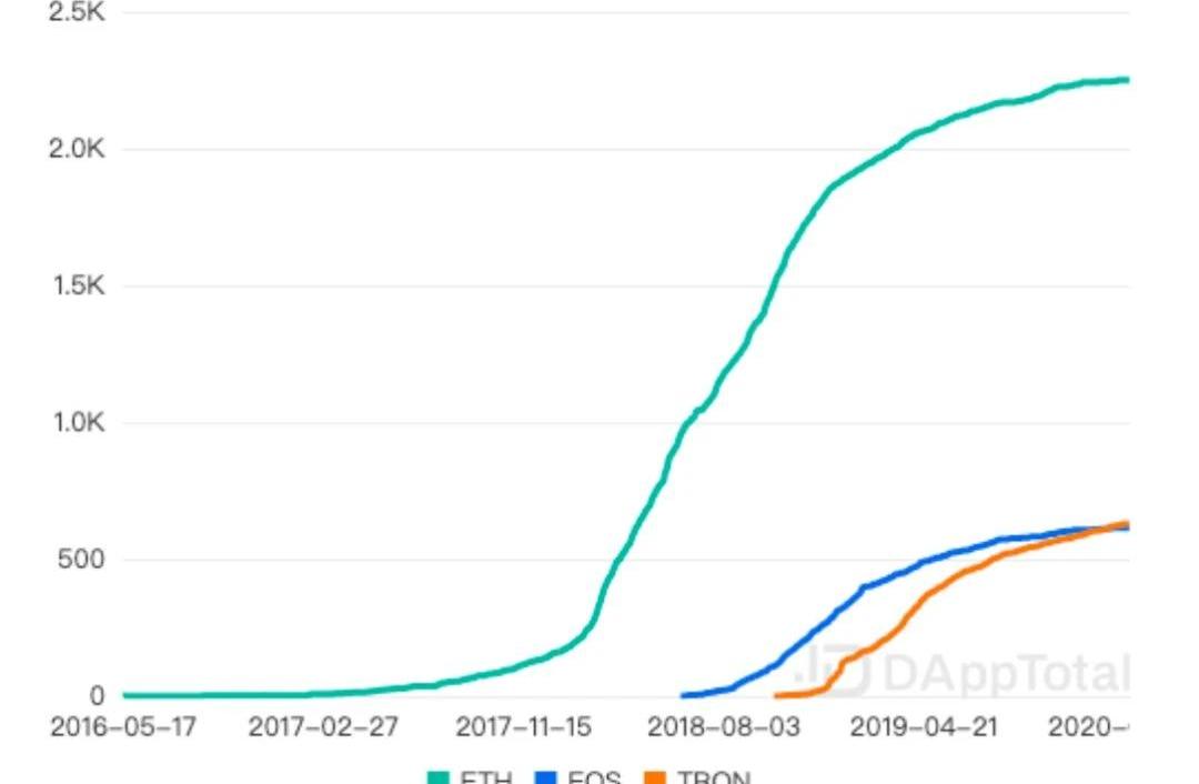 比特幣和以太坊的全網活躍地址數,Coinmetrics.io從市場上漲行情的歷史數據而言,根據加密數字貨幣交易所Binance的數據顯示,2018年12月10日,BTC和ETH同時達到自2017年以來的歷史最低點,分別為3149USD和81.79USD,此后一路上漲,在2019年6月24日達到高點,目前回落后反彈至8660USD和162USD,近1年內最高漲幅分別是444%和442%,目前相距最低點漲幅分別為275%和198%。顯然,BTC和ETH在近期的反彈中出現分化,ETH的漲幅不及BTC漲幅,僅為后者的72%。顯然,與上一輪歷史數據相比,ETH的上行空間依然巨大。與同類智能合約平臺相比被低估在同類智能合約平臺原生數字貨幣的市場表現中,ETH的價值也被大大低估。從網絡生態的基礎數據相比較,截止目前,創建在以太坊上的DApp數量是遠遠超過同類型區塊鏈平臺,達到EOS和TRON平臺中DApp數量的近4倍。