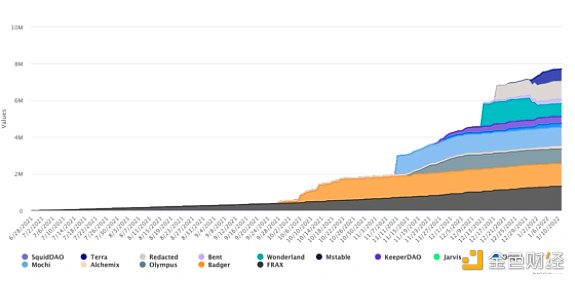 Terra作為Cosmos系亮眼的超新星,帶著它獨有的穩定Native Token —— UST來嘗試來征服世界,UST是相對獨特的。可以看出Do Kwon有著巨大的野心,他跟Daniele更是一拍即合的把兩個非傳統抵押型穩定幣綁定在一起。隨著Terra生態繁榮和排名的節節攀升,更是給了UST有了巨大金融實力來爭奪穩定幣的王座。最近的數據他們已經開始加速布局Convex,2022剛開始就購入了超過60w的CVX。
