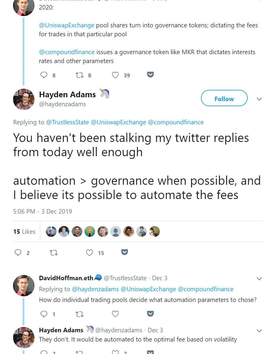 Uniswap是另一個很好的例子。VitalikButerin經常說Uniswap是他最喜歡的以太坊應用,因為它很簡潔,而且完全消除掉了所有的人類參與。你看,Vitalik在這點上也是個比特幣派!我最近寫了一條推特,提議Uniswap可以把它們的流動性提供者token轉變成治理token。用這種辦法,他們就可以調整他們所收取的手續費的標準。我們可以讓UniswapLPtoken持有者來管理他們所在的資金池,就像MKR治理MakerDAO那樣。Uniswap創始人HaydenAdams回應我為什么Uniswap要走完全自動化、剝除人類參與的路線: