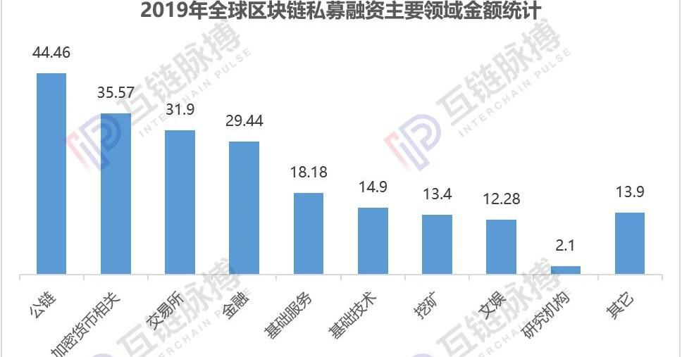 在2019年斬獲融資的468個項目中,公鏈、加密貨幣相關、交易所和金融四大領域最受資本青睞。互鏈脈搏研究院統計數據顯示,2019年公鏈、加密貨幣相關、交易所和金融領域的融資金額分別為44.46億元、35.57億元、31.9億元和29.44億元,四大領域融資金額占比合計高達66%。