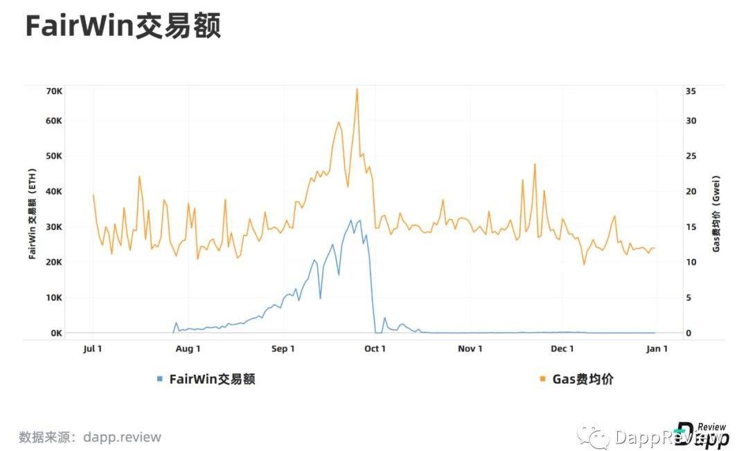 值得一提的是,去年12月,幣安發行了一系列基于ERC-1155的限量收藏NFT,一舉成為近期交易最活躍的資產。這些NFT的鎖倉ENJ代幣僅有0.5ENJ,平均交易價格卻在100-200美金之間,最高甚至達到20,000ENJ,可見幣安的品牌溢價和稀缺性給其NFT帶來了強有力的價格支撐。高風險-Fairwin高風險類Dapp一直是行業內敏感的話題,其中包含各類資金盤。但我們必須承認,該品類Dapp一直保有很高的用戶參與度,玩家在這里與貪婪和恐懼共舞。以Fairwin為例,這是一個顯而易見的龐氏騙局,然而在其崩盤之前總共有19208個地址參與了游戲,總共交易額超過69萬ETH,并給以太坊貢獻了將近9,000ETH的GasFee。